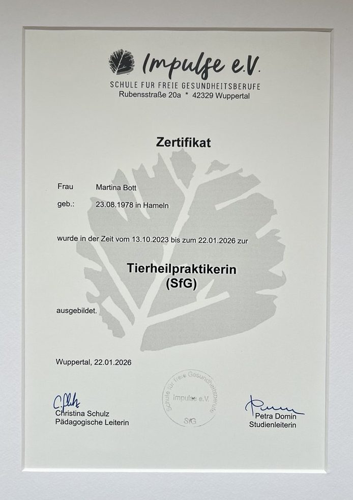 Diese Erfahrungen haben meinen Blick auf Tiergesundheit nachhaltig geprägt und waren letztlich der Auslöser dafür, mich zur Tierheilpraktikerin ausbilden zu lassen.